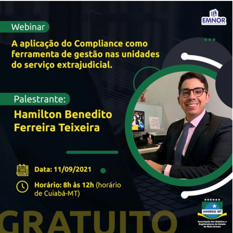 A Associação dos Notários e Registradores do Estado de Mato Grosso (ANOREG/MT) e a Escola Mato-grossense de Notários e Registradores (EMNOR) promoverá gratuitamente, no dia 11/09/2021, das 8h às 12h (horário de Cuiabá/MT), o webinar “A aplicação do compliance como ferramenta de gestão nas unidades do serviço extrajudicial”. A palestra será proferida por Hamilton Benedito Ferreira Teixeira.