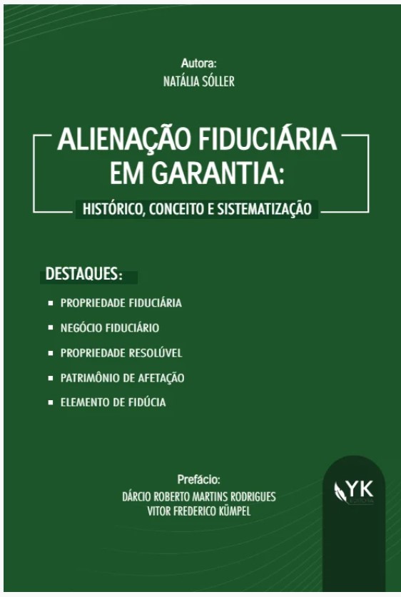 A YK Editora publicou o livro de autoria de Natália Sóller, intitulado “Alienação Fiduciária em Garantia: Histórico, Conceito e Sistematização”. A obra, que conta com mais de 140 páginas, foi prefaciada por Vitor Frederico Kümpel e Dárcio Roberto Martins Rodrigues e pode ser adquirida em pré-venda com desconto.