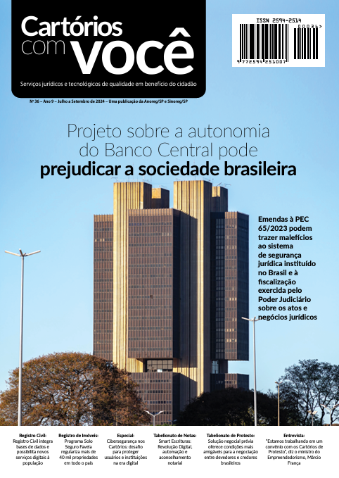 A Associação dos Notários e Registradores do Brasil (ANOREG/BR) publicou a edição n. 36 – Ano 9 – Julho a Setembro de 2024 da revista “Cartórios Com Você”. A revista é uma publicação trimestral do Sindicato dos Notários e Registradores do Estado de São Paulo (SINOREG-SP) e da Associação dos Notários e Registradores do Estado de São Paulo (ANOREG-SP) e traz como matéria de destaque a Proposta de Emenda à Constituição n. 65/2023 (PEC), que amplia atribuições do Banco Central do Brasil (BACEN) incluindo algumas exercidas por Notários e Registradores.