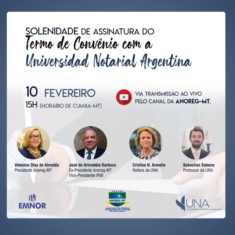 A solenidade virtual de assinatura do documento ocorrerá no dia 10 de fevereiro de 2021, às 15h (horário de Cuiabá/MT) e será transmitida ao vivo, pelo canal da ANOREG/MT, no YouTube. Participarão do evento a Presidente da ANOREG/MT, Velenice Dias; o ex-Presidente da ANOREG/MT e Vice-Presidente do IRIB, José de Arimatéia Barbosa; a Reitora da UNA, Cristina Armella; e o Professor da UNA, Sebastian Sabene.