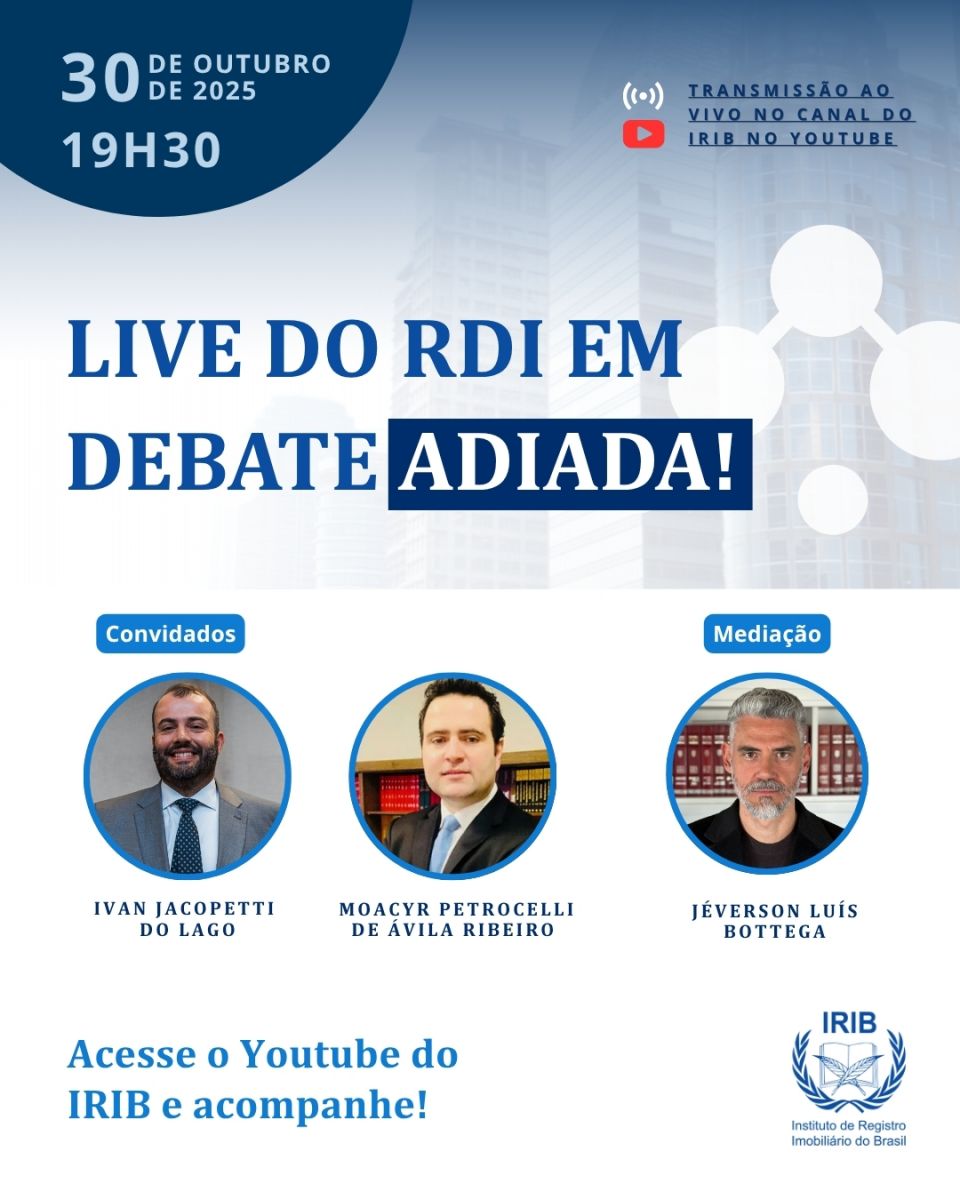 O Instituto de Registro Imobiliário do Brasil (IRIB) realizará, no dia 30 de outubro de 2025, às 19h30 (horário de Brasília), o terceiro episódio do ciclo anual da live “RDI em Debate”, uma iniciativa que fortalece o diálogo entre teoria e prática no universo do Direito Registral Imobiliário. A transmissão será feita pelo canal oficial do IRIB no YouTube. Os dois temas que serão abordados neste episódio foram publicados na Revista de Direito Imobiliário n. 98 (RDI).