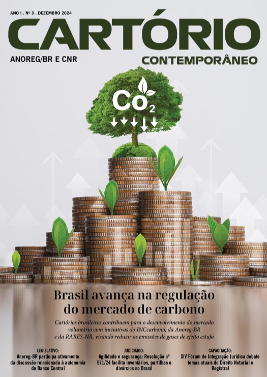 A Associação dos Notários e Registradores do Brasil (ANOREG/BR) e a Confederação Nacional de Notários e Registradores (CNR) publicaram a edição n. 3 da revista “Cartório Contemporâneo”, que traz como matéria de capa o avanço brasileiro na regulação do mercado de carbono. A publicação trata, no âmbito nacional, dos principais acontecimentos nos Três Poderes que impactam os serviços de notas e registros, dentre outros temas.
