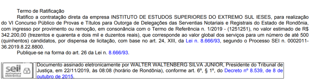O termo de ratificação de dispensa de licitação para a contratação do IESES foi assinado em 22 de novembro e publicada na edição desta segunda-feira (25) no Diário da Justiça do TJ RO.