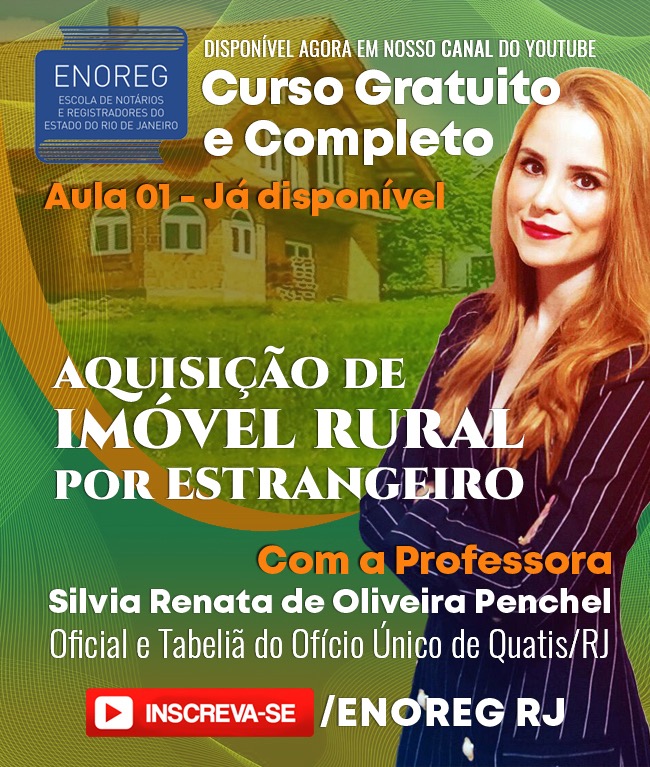 A Escola de Notários e Registradores do Estado do Rio de Janeiro (ENOREG-RJ) disponibilizou, em seu canal na plataforma do YouTube, a primeira aula do curso intitulado “Aquisição de Imóvel Rural por Estrangeiros”. A aula é ministrada pela Oficial e Tabeliã do Ofício Único de Quatis/RJ, Silvia Renata de Oliveira Penchel.