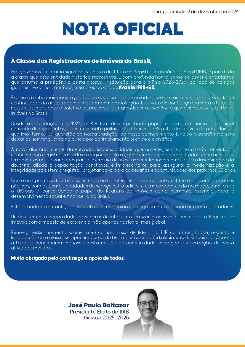 A Nota Oficial, endereçada aos Registradores Imobiliários brasileiros, expressa a gratidão de José Paulo Baltazar e ressalta a responsabilidade da nova Diretoria eleita. Baltazar também destaca a necessidade de fortalecimento das relações institucionais com os poderes públicos e demais entidades do Serviço Extrajudicial.