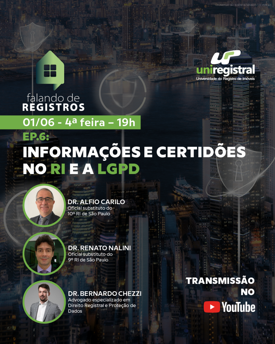 Participarão da transmissão o Oficial Substituto do 10º Registro de Imóveis da Capital/SP, Dr. Alfio Carilo Jr.; o Oficial Substituto do 9º Registro de Imóveis da Capital/SP, Dr. Renato Nalini e do Advogado especializado em Direito Registral e proteção de dados, Bernardo Chezzi.