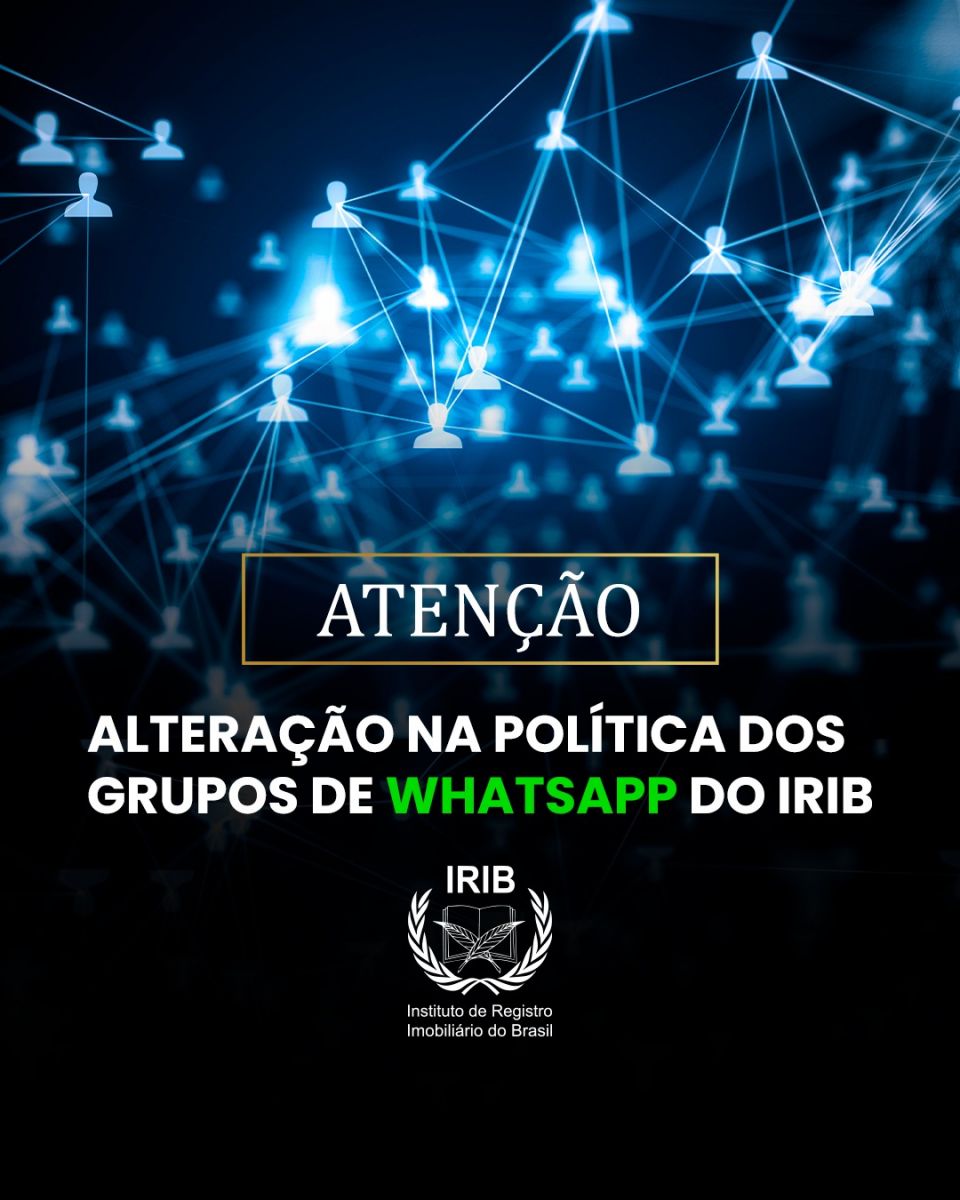 O Instituto de Registro Imobiliário do Brasil (IRIB) criou uma Política de Uso para os seus grupos de WhatsApp. A reformulação quanto à participação tem como objetivo prestigiar os associados ao Instituto e aprimorar a divulgação de informações. A mensagem foi postada hoje, 28/02/2025, nos grupos do WhatsApp do IRIB, acompanhada da Carta do Presidente, esclarecendo os motivos desta reformulação. O documento ainda esclarece que serão mantidos “grupos abertos para todos os associados, independentemente da categoria profissional” e que, paralelamente, serão criados “um ou mais grupos destinados exclusivamente a associados Registradores de Imóveis.”