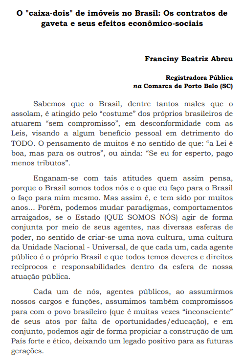 A coluna intitulada “Migalhas Notariais e Registrais” apresenta artigo assinado pela Titular do Ofício de Registro de Imóveis e Civil da Comarca de Porto Belo/SC, Franciny Beatriz Abreu, que discute a gravidade dos chamados “contratos de gaveta”, prática corriqueira dos brasileiros.