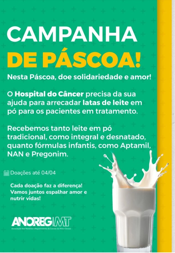 A Associação dos Notários e Registradores do Estado do Mato Grosso (ANOREG/MT), com o intuito de mobilizar Tabeliães e Registradores para contribuírem com o Hospital do Câncer, promove a campanha “Páscoa Solidária”. O objetivo é arrecadar latas de leite em pó, um item essencial na alimentação de quem enfrenta o tratamento oncológico. O prazo de arrecadação nos Cartórios é até o dia 4 de abril. As doações devem ser remetidas à Associação entre os dias 7 e 8 de abril. A campanha reforça o compromisso social da classe, mostrando sua dedicação às causas humanitárias e ao bem-estar da comunidade, além de prestação de serviços essenciais à população.
