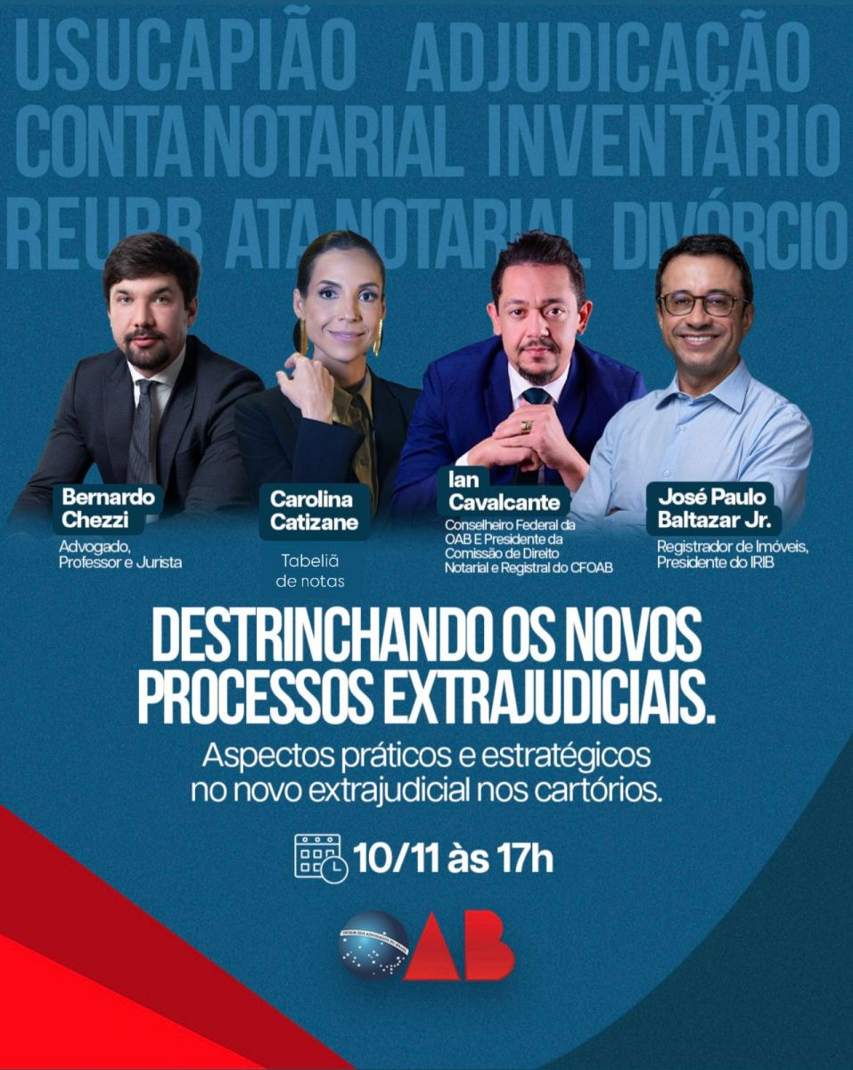 O Presidente do Instituto de Registro Imobiliário do Brasil (IRIB), José Paulo Baltazar Junior, participará hoje, 10/11/2025, a partir das 17h, do evento virtual promovido pelo Conselho Federal da Ordem dos Advogados do Brasil (CFOAB), por intermédio da sua Comissão Especial de Direito Notarial e Registral, intitulado “Destrinchando os Novos Processos Extrajudiciais – As oportunidades da nova advocacia e dos cartórios”