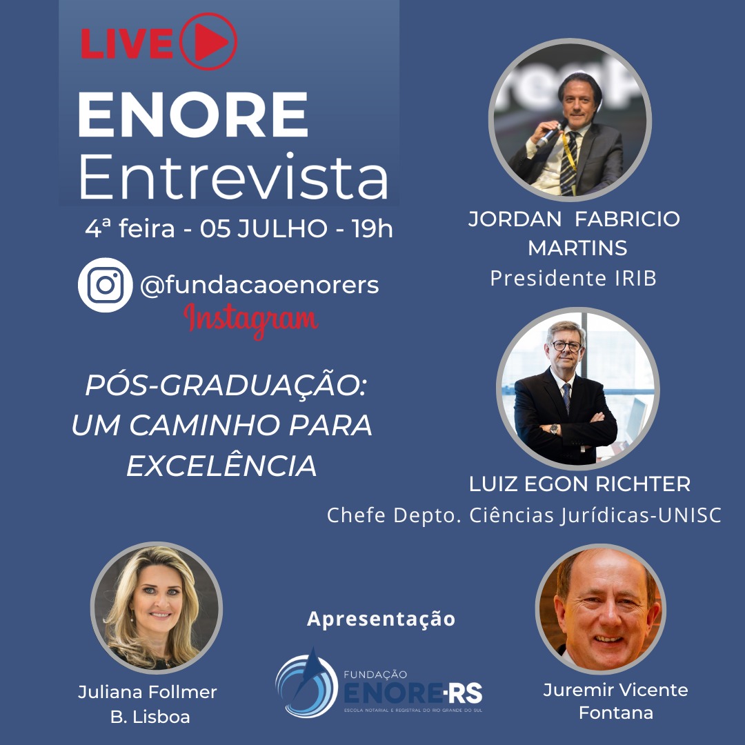 Com apresentação de Juliana Follmer B. Lisboa e Juremir Vicente Fontana, participará da live, além do Presidente do IRIB, um dos Coordenadores do curso, Dr. Luiz Egon Richter. O evento será transmitido pelo Instagram da ENORE-RS.