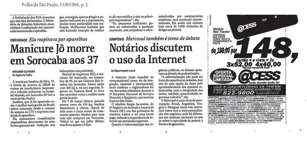 Primeiro cartório a utilizar a internet na América Latina é destaque na Folha de S. Paulo, em 1996