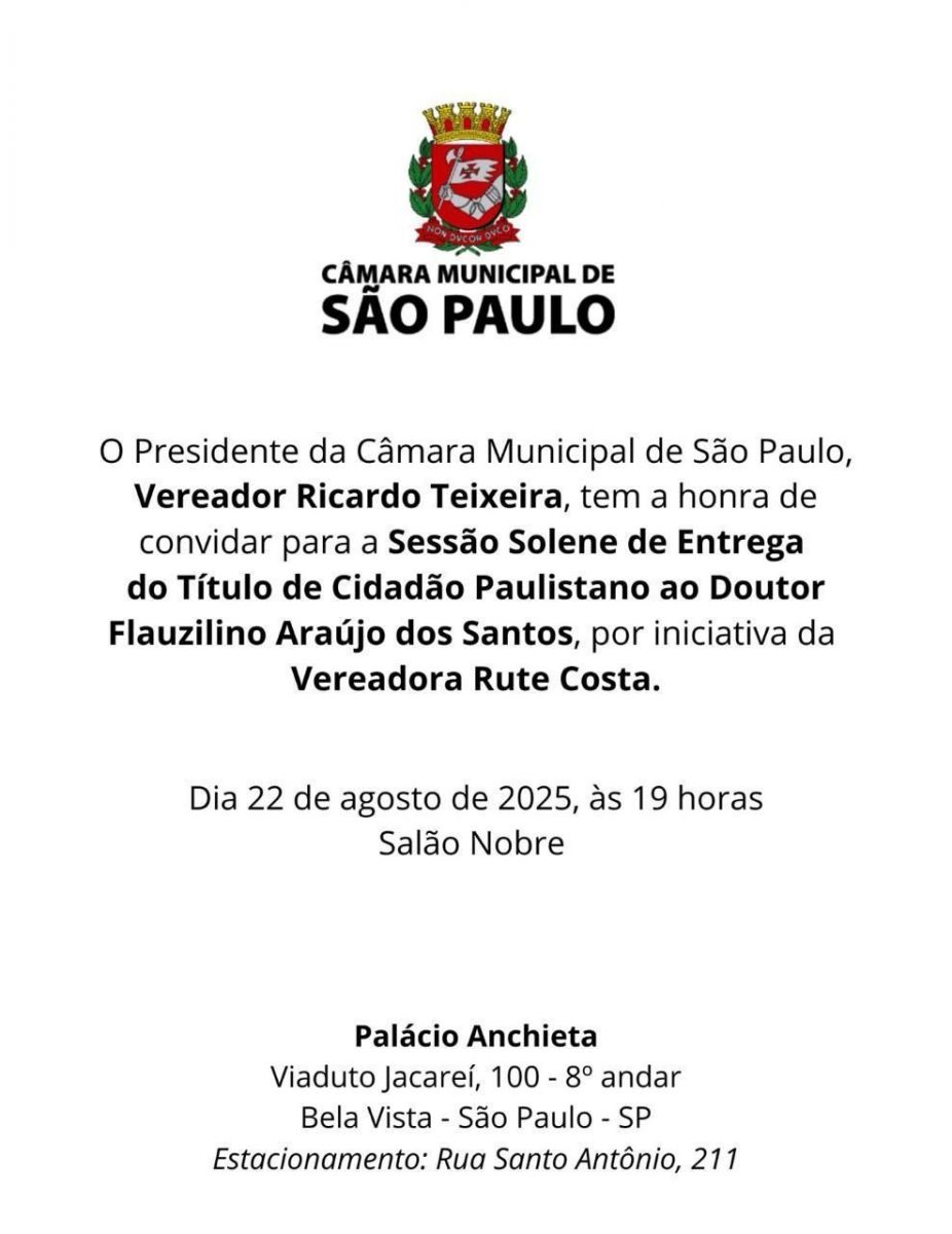 O Primeiro Oficial de Registro de Imóveis de São Paulo, Flauzilino Araújo dos Santos, receberá, da Câmara Municipal de São Paulo, o título de Cidadão Paulistano. A homenagem é uma iniciativa da Vereadora Rute Costa e será entregue pelo Presidente da Câmara, Vereador Ricardo Teixeira.