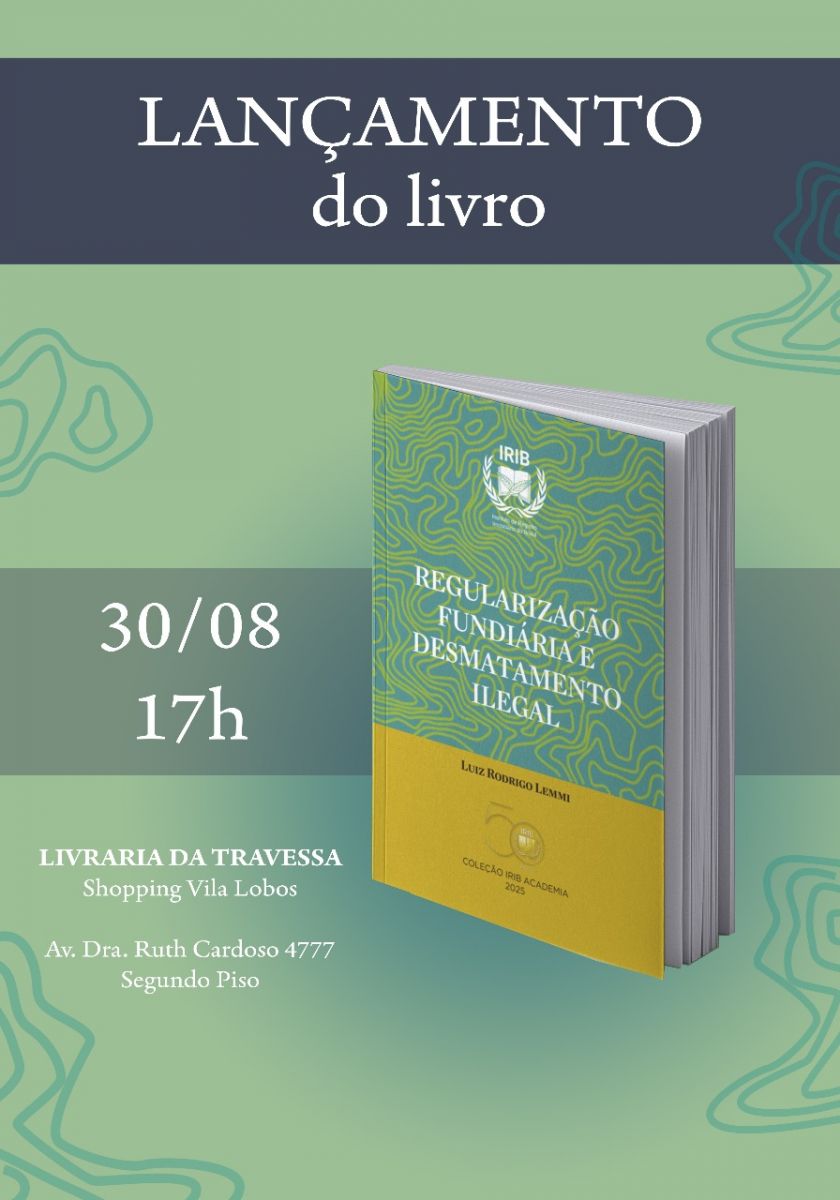 O livro de Luiz Rodrigo Lemmi, intitulado “Regularização Fundiária e Desmatamento Ilegal” e publicada pelo Instituto de Registro Imobiliário do Brasil (IRIB), teve seu lançamento oficial no L Encontro dos Oficiais de Registro de Imóveis do Brasil, evento realizado no início de agosto pelo IRIB. Agora, a obra também será lançada na cidade de São Paulo/SP, em tarde de autógrafo promovida pelo autor em 30/08/2025, a partir das 17h, na Livraria da Travessa, localizada no Shopping Villa Lobos (Av. Dra. Ruth Cardoso, 4777 – Jardim Universidade Pinheiros, São Paulo/SP).