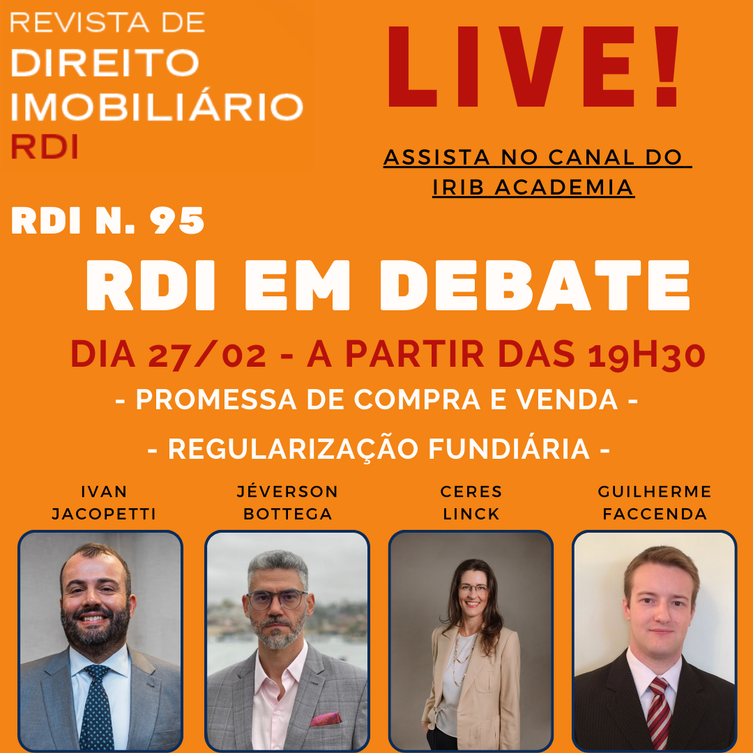 O segundo episódio do programa “RDI em Debate” apresentará as opiniões de Ceres Linck dos Santos e Guilherme Augusto Faccenda, autores de dois artigos publicados na edição n. 95 da Revista de Direito Imobiliário (RDI). O programa, apresentado pelos Coordenadores da RDI, Doutores Ivan Jacopetti do Lago e Jéverson Luis Bottega, será exibido no dia 27/02/2024, a partir das 19:30h, canal do IRIB no YouTube. O “RDI em Debate” é uma produção do Instituto de Registro Imobiliário do Brasil (IRIB) que tem como objetivo difundir os estudos divulgados nas páginas da RDI, publicada em parceria com a Editora Thomson Reuters/Revista dos Tribunais.