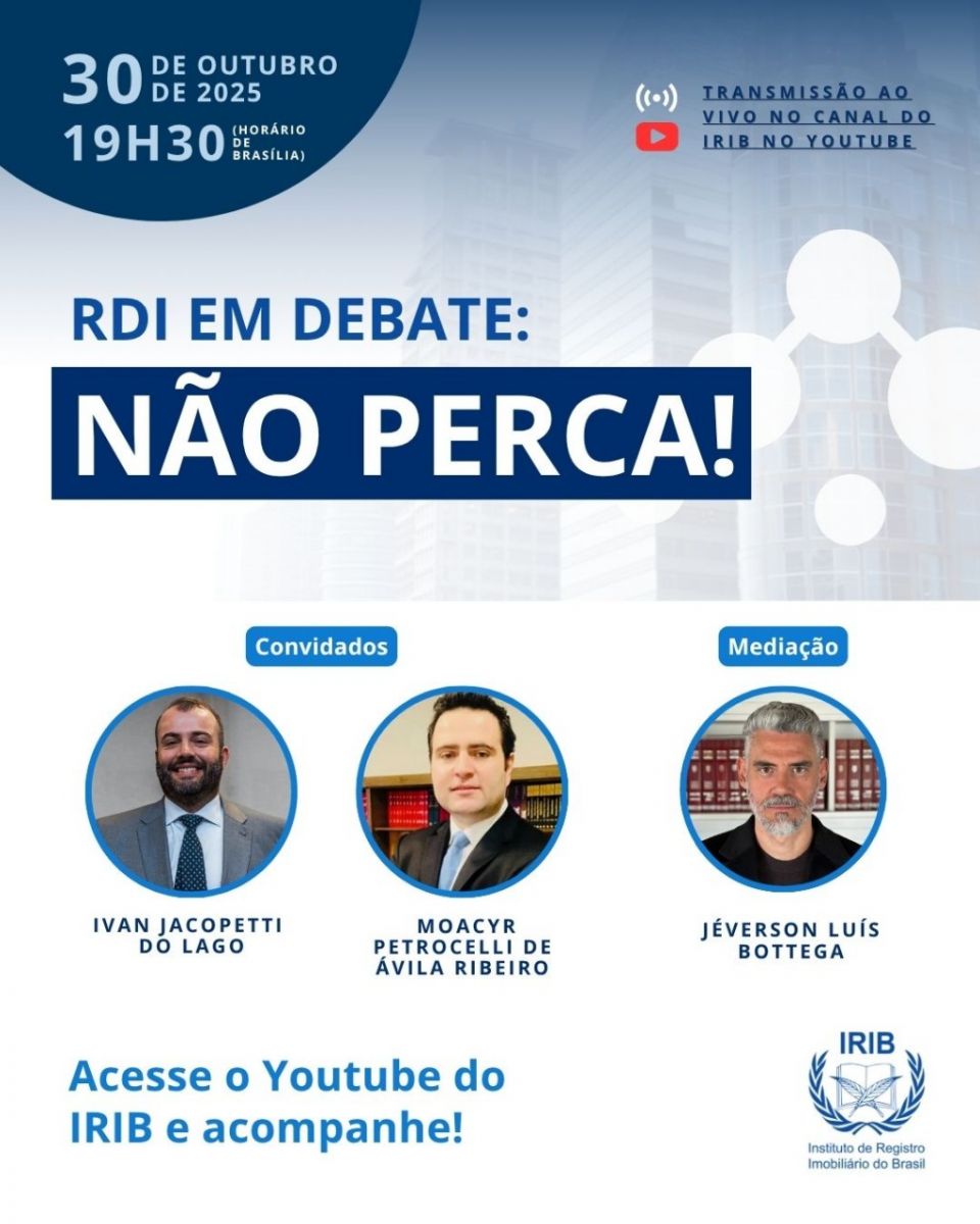 O Instituto de Registro Imobiliário do Brasil (IRIB) realizará hoje, 30/10/2025, a partir das 19h30 (horário de Brasília), o terceiro episódio do ciclo anual da live “RDI em Debate”, uma iniciativa que fortalece o diálogo entre teoria e prática no universo do Direito Registral Imobiliário. A transmissão será feita pelo canal oficial do IRIB no YouTube e os dois temas que serão abordados neste episódio foram publicados na Revista de Direito Imobiliário n. 98 (RDI).