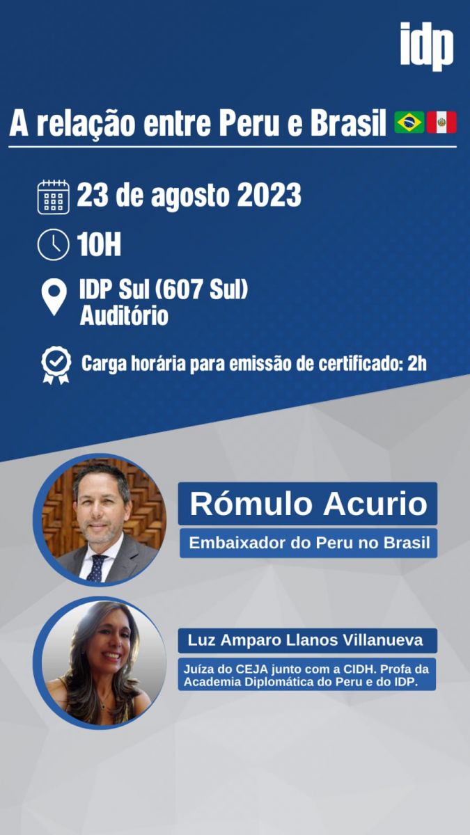 O Vice-Presidente do Instituto de Registro Imobiliário do Brasil (IRIB), José de Arimatéia Barbosa, foi convidado por Luz Amparo Llanos Villanueva para a Aula Magna intitulada “A relação entre o Peru e Brasil”, que será promovida pelo Instituto Brasiliense de Direito Público (IDP). A aula será ministrada pelo Embaixador da República do Peru no Brasil, Rômulo Acurio, e pela Instrutora em Direito Internacional dos Direitos Humanos para pessoal da Organização das Nações Unidas (ONU) em missões de Paz e Juíza Revisora do Programa CEJA com a Corte Interamericana de Direitos Humanos, Luz Amparo.
