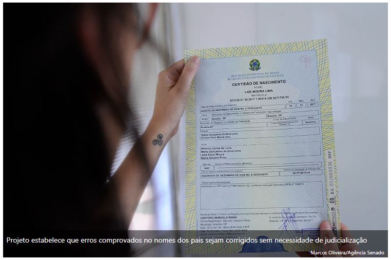 Projeto estabelece que erros comprovados no nomes dos pais sejam corrigidos sem necessidade de judicialização.