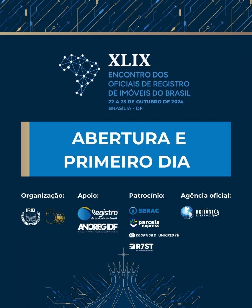 Com auditório lotado, o XLIX Encontro teve início com a Solenidade de Abertura, onde foi exibido um vídeo comemorativo do quinquagésimo aniversário do IRIB, além de vídeos de parceiros e patrocinadores do XLIX Encontro. Na sequência, a Diretora Social do IRIB, Luísa Helena Iung de Lima Bonatto, deu boas-vindas aos participantes e ressaltou a importância e os cinquenta anos do Instituto. Foram convidados para integrarem o rol de autoridades presentes o Presidente do IRIB, Jordan Fabrício Martins; o Presidente da Associação dos Notários e Registradores do Brasil (ANOREG/DF), Rogério Portugal Bacellar; o Presidente do Registro de Imóveis do Brasil (RIB), Ari Álvares Pires Neto; o Presidente do Operador Nacional do Sistema de Registro Eletrônico de Imóveis (ONR), Juan Pablo Correa Gossweiler; o Juiz Auxiliar da Corregedoria Nacional de Justiça do Conselho Nacional de Justiça (CN-CNJ), Marcelo Martins Berthe; e o Ministro do Turismo Celso Sabino.